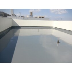 腰壁は下地補修材にて亀裂補修を行い、浮き部はエポキシ樹脂注入後アンカーピン固定補修を行い、屋上防水は劣化箇所を取り除き補修後、ウレタン塗膜防水(2層仕上げ)を行いました。