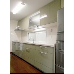 リフォームのポイント ・スライド収納にし収納力がアップ ・吊戸棚に電動式の乾燥庫を設置し衛生面でも安心 ・木枠だった窓枠にカバーをつけ、水撥にも強く ・天井照明も取替え、明るいキッチンに