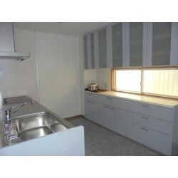 収納がしづらいコの字型キッチンをすっきりと動線のよい2列型キッチンに。室内の内装リフォームに合わせ、シンプルなキッチンカラーで統一。キッチン側には吊戸は設けずOPENで開放的なキッチンに。 既存の窓を有効利用して明るさを取り入れた、壁一面の収納設備は家電や食器などたくさんの収納が可能です