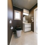 モノトーンや濃いブラウンの基本は変えずに、ブラウン色を多く配し、趣をかえる事をご提案、便座の色も合わせてアクセントにしました。トイレはパナソニック/アラウ―ノ、洗面はトクラス/エポックです。
