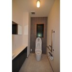 見た目がパブリック的でないようにまとめることを提案。 デザインに優れ、脱臭・調質効果のあるエコカラットをアクセントで使うことを提案。照明・換気扇は清潔感と使い勝手を追及するため人感センサー付にしました。