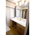 中古の戸建住宅を購入されて洗面台交換。大きな鏡で広々。