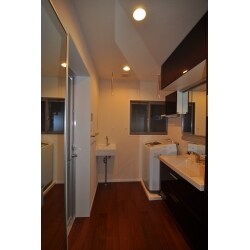 防水タイプのフローリングと茶系の洗面扉を採用し、電球色のLEDライトを設置して柔らかな雰囲気を出しました。 浴室乾燥暖房機を2室暖房にして、夏の涼と冬の暖房ができるように提案しました。 物干し金物は脱着可能な商品を提案し取付けました。