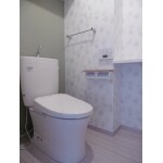 床には水かかりに強いトイレ専用のフローリングを貼りました。壁には補強を入れ、棚付紙巻器を設置しました。棚に手をついて体を支えられ、手摺代わりにご利用いただけます。