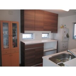 以前のキッチンは収納スペースが少なくお困りとの事でした。システムキッチンの後側の空いているスペースを活用し、間口1800mmのキャビネットを取付ました。カウンターの高さは103㎝のハイカウンターキャビネットを、吊戸棚は90㎝のロング戸棚をお選びになり収納スペースが一段とアップしました。こちらの商品“キッチンファニチャー”は高さ、奥行きの豊富な組み合わせで様々なスペースに対応できます。
