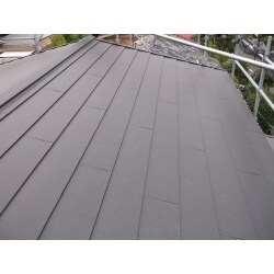 経年変化で屋根の劣化が激しく進み、塗装表面のツヤはなくなり色も落ち、大小のクラック(ひび割れ)も見受けられました。 放っておくと建物の寿命が縮まり、雨漏りの恐れもありましたので、長期的にコストパフォーマンスの良いカバー工法をご提案させていただきました。