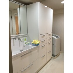 長年使用してきたことによる、老朽化のため、洗面化粧台リフォームのご依頼をいただきました。 最もお困りであった収納スペースについては、フルスライドタイプの洗面化粧台と大容量の収納が叶う、トールキャビネットを設置して解消しました。 洗面周りの小物が全て中に納まったので、見た目もスッキリする上にホコリも被りません。 内装は全て清潔感のあるホワイトに統一しました。 壁や床に使用している素材は水や汚れに強い塩化ビニルなので、簡単な水拭きで綺麗が保てます。 「汚れが目立ってしまうかもしれない・・」と少しご不安に思われていたので、洗面化粧台やトールキャビネットの扉は鏡面仕様にしています。 こちらもサッと一拭きで、汚れを落とすことができます。 雰囲気がガラリと変わり、お困りであった収納スペースや室内の印象も解消することができました。