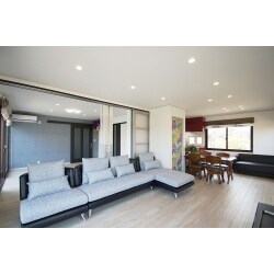 無駄な動線を無くし、スッキリとした使いやすい間取りプランをご提案させてただきました。スライディングウォールの開閉によって、広々としたパーティールームとしても、家族団らんのくつろぎスペースとしてもお使いいただけます。
