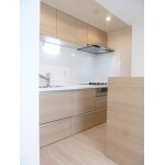 キッチン横にあった給湯器は、バルコニーへ移設。その分大きめのキッチンを入れることが可能になりました。キッチンはお部屋の優しい風合いになじむよう、淡い木目柄を選定しました。レンジフードはフラットスリムタイプのものなので、お手入れも簡単です!