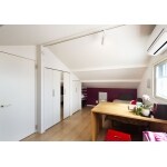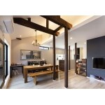 洋室・和室をすべて取り払い、ゆとりあるLDKになりました。天井を抜いて、勾配天井を活かした伸びやかな空間に広げました。構造上はずせない柱は、美しく塗装し空間のアクセントに。柱や梁、勾配天井で変化に富んだ空間なりました。