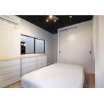 寝室は、和室部分を洋室に変更しました。 LDKを出来るだけ広く取れるようにベッドと収納が置ける広さにしました。 天井クロスは黒にして、シックな雰囲気になりました。 大容量のクローゼットを設置し、収納力もアップしました。 階段から寝室へと直接入れる動線がポイントです。