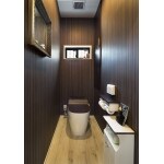 遊び心のあるブラウン系のストライプ柄クロスを選び、 シックでスタイリッシュな仕上がりになりました。 洗面台脇の収納スペースの上部をトイレ側収納にご提案しました。