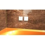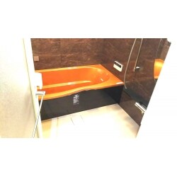 様々な部分の色や質感を選択できるリノビオなら、どのお客様の理想もバッチリ叶えます! 今回のお客様は高級感をお求め、との事。高級といえばゴールド!浴槽をゴールドオレンジにしました。壁パネルもストーン調、エプロンも黒色にし、大胆ですが統一感も感じます。 音楽を聴きながらくつろぐことが出来るよう、Bluetooth接続でお好きな音楽が流せるようにしました。スマホを持ってお風呂に入り、ピッとかざして接続させたらお好きな曲を選択し、ゲームなどをしながら汗を流す・・・学生のお子様からお父さんも喜んで頂ける機能です。
