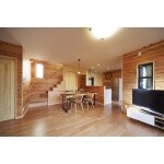 間取りを変更しキッチンを移設することで、開放的で広々としたリビングになりました。 玄関からLDKにかけて全面の壁に無垢の杉板を横目に貼り、ログハウス風の空間を演出しています。
