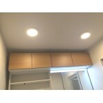 既存吊り戸棚が照明に干渉してしまい、扉が開ききらない状態でかつ、洗面の雰囲気を明るくしたいとのご要望でしたので、薄い、ダウンライト風のシーリングライトをご提案しました。 あえて本物のダウンライトにしなかったのは、RC造で設置可能か調べるために天井開口をしなければいけなかったのですが、費用も時間もかけたくないとのことだったので、薄いタイプのシーリングライトをご提案し、吊り戸に干渉しないように設置しました。 また明るくされたいとの事でしたので、100Wの大容量を2つ付けました。 その他商品のオプションは、お客様と一緒にショールームに行き、決めていただきました。