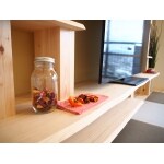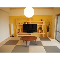 和室として1つの部屋に間仕切られていましたが、「琉球畳」を埋め込み、ダイニングとフラットにしました。 壁は黄色で塗装し、部屋全体を明るく見せてくれています。 また壁面には造作棚を設け、デザイン性あふれる新たな和のスペースを提案しました。
