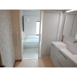 浴室に段差が10cm有ったのでバリヤフリー化に手すりを浴槽横・浴槽までの壁面・出入口横・シャワーフックを手すりとして使えるタイプに変えて、浴室内どこに居ても 手すりに触れる様にしました。 浴槽も人造大理石にする事により清掃性と将来的に色褪せ等を 軽減する事が期待できます。 洗面台も永く使用している為、清掃性が落ちている・開き扉の為、収納性が悪い為思い切って3wayタイプの物に交換。 雰囲気に合わせてクロスのアクセントを入れてみました。