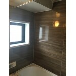 木目調のアクセントパネルを一面ではなく全面仕様でご提案することで、より高級感を感じられる空間としてご提案させていただきました。梁と窓のある浴室であったため、これらの加工も含まれています。
