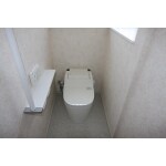 トイレは向きを替え、手前にあった手洗室との間仕切りを撤去して、一つの空間にし、広さを確保。 タンクレストイレへ交換し、クロスとクッションフロアも貼替え、棚板と一体になっている手摺も取付ました。