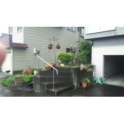 道路から一段高くなった庭に道路から登れる階段に手すりと、玄関に至る階段に手すりをつけて欲しいという要望と 高基礎の塗装が剥げ見苦しくなったので、塗装を依頼されました。