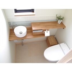 ナチュラルな雰囲気ということで木製のカウンターとモザイクタイルを提案し、トイレを少しでも広く使える様にタンクレスの便器をご提案。トイレ入り口横に収納新設を併せてご提案。