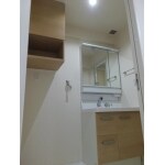 洗面室に取り付けられていた給湯器をベランダへ移設して空間をすっきりと使えるようにし、洗面化粧台と洗濯パンも交換。洗濯パン上部にキャビネットも取付け、内装も新しくしました。
