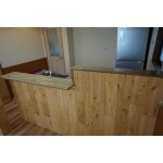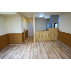雨漏れは屋上の防水が原因でしたので、本工事とは別にすぐに対応させていただきました。対面キッチンにされたいというご要望でしたので、キッチンと廊下を隔てていた壁を取り払い、天井の補強をすることをご提案いたしました。また、ご予算が最優先条件でしたので、既存の腰壁を残し、わんちゃんの脚にも優しい重歩行用クッションフロアを床材に使用することでコストダウンを図れたと思います。キッチンの腰壁や柱にはパイン材を張り、わんちゃん達の爪や汚れ対策をいたしましたが、同時にナチュラルテイストな雰囲気も出たのではないでしょうか。