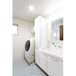 洗面脱衣室にスペースがあったため、サイドにタオルや洗剤などがストックできるトールキャビネットを付けて、収納力抜群の洗面化粧台へ変更しました。 三面鏡の鏡裏にも収納が付いているため、今までカウンターの上に置いていた化粧品のボトルなどがスッキリと片付き、お手入れがしやすくなりました。 ホワイトで統一しスッキリとした洗面化粧台に、床は施主様が明るい印象になるようイメージして選ばれた、レトロモダンなブルーのクッションフロアをアクセントで貼ることで、おしゃれな空間へと生まれ変わりました。 収納力があり使い勝手が良く、明るい洗面脱衣室にお喜びいただきました。