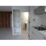 キッチンとの間仕切り壁もエアコンを設置する為の一部を残して撤去し、開放的な空間へ。システムキッチンも交換し、内装もリビングと同様、新しくしました。