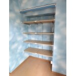 折戸のついた一般的なクローゼットの扉を取り払い、パソコンの周辺機器や書類がたくさん収納できるように可動棚を取付けました。扉を外した部分にはロールスクリーンを取付けました。