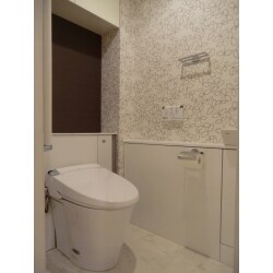 リフォーム前は、収納スペースのないトイレだったためスッキリと片付けておける収納一体型トイレ「LIXIL リフォレ」に交換しました。 お掃除用品などを人目に触れることなく収納することができ、キャビネットの中にタンクや配管が隠れているので、ホコリがかぶりにくく、以前に比べてお掃除がラクになりました。 空間を彩る内装には、優しげなリーフ柄のクロスと重厚感のあるダークブラウンのアクセントクロスを施工。 奥様がメーカーショールームで、一つ一つ色を合わせながら吟味したこだわりの内装で、既設の手洗い器も違和感なくマッチした、ナチュラルモダンテイストな空間に仕上がりました。