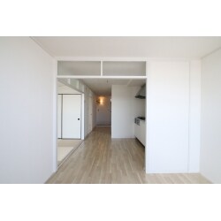 3DKタイプから2LDKへ間取り変更。トイレと洗面台を移設し、サニタリールームに仕上げました。現状のニーズに合致するよう明るめのCFに木部は白に塗装することで和室も洋室も繫がりのある空間となりました。