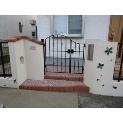 お子様がまだ幼い事もあり、安全の為に一緒にアルミ鋳物の門扉を付けました。アルミ鋳物の門扉でかわいさがアップしています。 門塀に付けた小窓から早速、娘さんが覗き込んでいました。喜んでもらえて良かったです。 ※ポストは既存の物を再利用しています。 最後は、家族みんなで葉っぱの形のタイルを貼って完成しました。