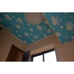 こもりやすい納戸の壁にも、調湿コントロールできる塗り壁「ダイヤトーマス」を施しました(クローゼット内にも施しました)。様々な物を置くことになるので、湿気に左右されやすい物の劣化を抑える目的もあります。天井には、もともと施主様のお好きな空のクロスが貼ってあり、施工する際に同じ空のクロスをきれいに貼り換えました。