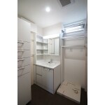 収納にこだわった洗面所です。 洗濯機置き場上部のデッドスペースも無駄にしません。