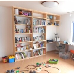 自宅で仕事をすることも多い職業柄、書斎スペースはリビングと隣接させ、書斎としてだけでなく家族と一緒に使えるようにというご要望がありました。 大工さんに造作していただいたオリジナルの本棚と机は大のお気に入りです。 期待以上の出来具合で大満足です。今は子供たちの玩具に占領されていますが、将来的には子供の机も一緒に並べられそうなので楽しみです。
