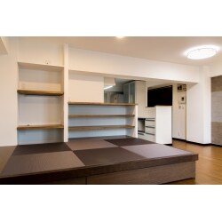 間取りを変更し部屋の広さ・収納の量などを最適化します。 既存のリビングと和室の間の壁を取り払い、2部屋を1部屋にして広々としたLDKを実現。 収納内の棚や引き出しなど、機能を増やすことで収納力をアップします。 リビングの一角に収納付きタタミスペース(畳が丘)を設けて和室として利用。小上がりになっていて棚と隣接しているので自由度の高いスペースです。 また、畳スペースの中は収納スペースになっているので、ここでも収納力を高めています。