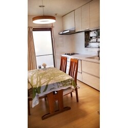 キッチンの色が濃い目なため、少し重い印象になっています。壁がタイル、レンジフードはプロペラ式とのことで、お掃除も大変。