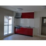 キッチンはタイルからパネルにし掃除しやすく、 コンロもビルトイン。 シングル水洗とし、色も部屋全体を白を基調としているため、落ち着いた華やかさのある赤としました。