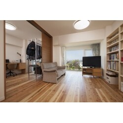 (旧積水化学工業株式会社での事例です。)贅沢な眺望を活かした、落ち着いてくつろげるリビング・ダイニングは、お子様の独立後には隣接する子供部屋と合わせてさらに広く。また奥様こだわりの回遊型の間取りや、悩みの種だった結露・カビ防止(断熱)施工などを取り入れ、快適さと便利さがぐんと増すレイアウト。眺望のいいリビングにくつろぐご主人と家族のくつろぐ姿をみながら趣味のパンづくりに励む奥様。家での時間が充実したものになるリノベーションをご提案。ご夫婦がお気に入りの無垢床を一面に敷いたリビングは、暑さ・寒さ・結露に困らされることなく外の眺望を楽しむことができるご夫婦自慢のリビングに。壁には一面造作収納を設え、たくさんの本などが収納できます。