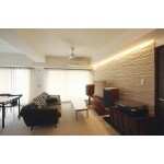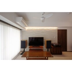 部屋全体が壁紙仕上げだったリビングは、アクセントとしてテレビ裏の壁面をタイル仕上げにしました。凹凸のあるタイルを使用し、間接照明によってできる影が非常にカッコイイです。また、細かい部分では露出されていたエアコンの配管を、目立たないようにカバーで綺麗に納めています。
