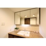 洗面化粧台はLIXIL「ルミシス」を使用し、ホテルのような高級感ある仕上がりになりました。お客様の要望である手元の照明は、三面鏡下部に設置できるようオーダーで作成しました。また、洗面室床下の配管を新しく結び直した際に、今後ユニットバスやキッチン等の水廻りをリフォームしやすいよう、先を見据えた配管工事を行いました。
