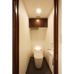 トイレはPanasonic「アラウーノ」を使用し、スッキリした空間に仕上げています。吊戸棚にはLIXIL「ミズリア」を選びました。間口調整ができるため、無駄な隙間を作ることなく施工が可能になります。