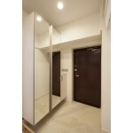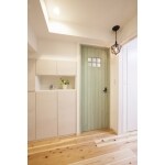 (旧積水化学工業株式会社での事例です。)築30年を超えているマンションでの不安の解消として、まずは室内をスケルトンにして断熱・給排水管を刷新、さらには二重床にすることで住まいの性能を向上。また、風が室内に豊かに流れるよう回遊型の間取りを採用。内装・インテリアは、アンティークな緑色の建具や自然のぬくもりを感じさせる漆喰の塗り壁などで「自分らしさ」を演出。住まい作りには、自分達も手を掛けたいという奥様のご希望があちこちに活かされて提案をいたしました。玄関には、大容量のシューズラックを設え、扉を鏡張りにして広さを演出しました。