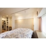 (旧積水化学工業株式会社での事例です。)築30年を超えているマンションでの不安の解消として、まずは室内をスケルトンにして断熱・給排水管を刷新、さらには二重床にすることで住まいの性能を向上。また、風が室内に豊かに流れるよう回遊型の間取りを採用。内装・インテリアは、アンティークな緑色の建具や自然のぬくもりを感じさせる漆喰の塗り壁などで「自分らしさ」を演出。住まい作りには、自分達も手を掛けたいという奥様のご希望があちこちに活かされて提案をいたしました。寝室から続くウォークスルークローゼット。南側のリビングから入る風がこの動線を通って、寝室にまで流れこんでくるのが、とても気持ち良い間取りに仕上がりました。