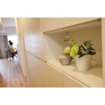 (旧積水化学工業株式会社での事例です。)築30年を超えているマンションでの不安の解消として、まずは室内をスケルトンにして断熱・給排水管を刷新、さらには二重床にすることで住まいの性能を向上。また、風が室内に豊かに流れるよう回遊型の間取りを採用。内装・インテリアは、アンティークな緑色の建具や自然のぬくもりを感じさせる漆喰の塗り壁などで「自分らしさ」を演出。住まい作りには、自分達も手を掛けたいという奥様のご希望があちこちに活かされて提案をいたしました。蔵書をすっきり収納できるよう廊下の壁一面には、ご夫婦が特に希望されていた本棚を配置しました。たくさんある蔵書をすっきりと、らくらく収納できる、白色・フラットな扉付きの本棚とし、すっきりと見せています。
