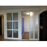 既存のお部屋は、壁一面が収納クローゼットになっていましたが、隣室の勉強部屋拡張の為、クローゼット部分を全て解体してしまった為、新たにクローゼットを新設しました。 その際、全体のバランスを変えたくないとのことでしたので、クローゼット扉を再利用という形で仕上げました。