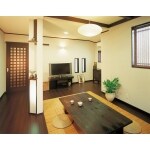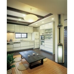 ・可能な限りLDKを広げ、天井を高くして梁を見せる 演出。 ・構造上取り外せない柱は、間接照明を組み入れてリビ ングのアクセントに。 ・落ち着きのある濃い色合いの床材は床暖房を採用。 白基調のキッチンが映えるLDKに。 ・旧家のものを再利用しながら、構造を一新。内装仕上げ はこだわりの家具と協調する和モダン調に。