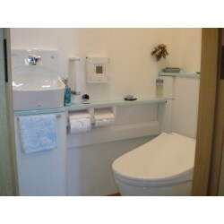 ・「便器とは別に手洗い器を設置したい」というお客様の ご要望に応えるために、工期の短縮や仕上りを考慮して システムトイレを採用。 ・0.4坪弱の空間に手洗い器や収納を実現させ、限りある スペースをできる限り有効活用して機能も充実した快適 なトイレ空間にする。 ・オート開閉機能が付いた便利なウォシュレットを採用。