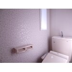 2階のトイレはご家族やお客様も使用されるので、アクセントに光沢のある壁紙を配して、明るく清潔感のある印象に。